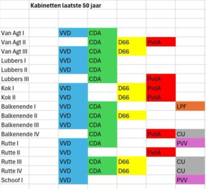 Alt-tekst voor SEO: Lijsttrekkers VVD, CDA, D66 en PvdA die al decennia in de Nederlandse regering zitten.
